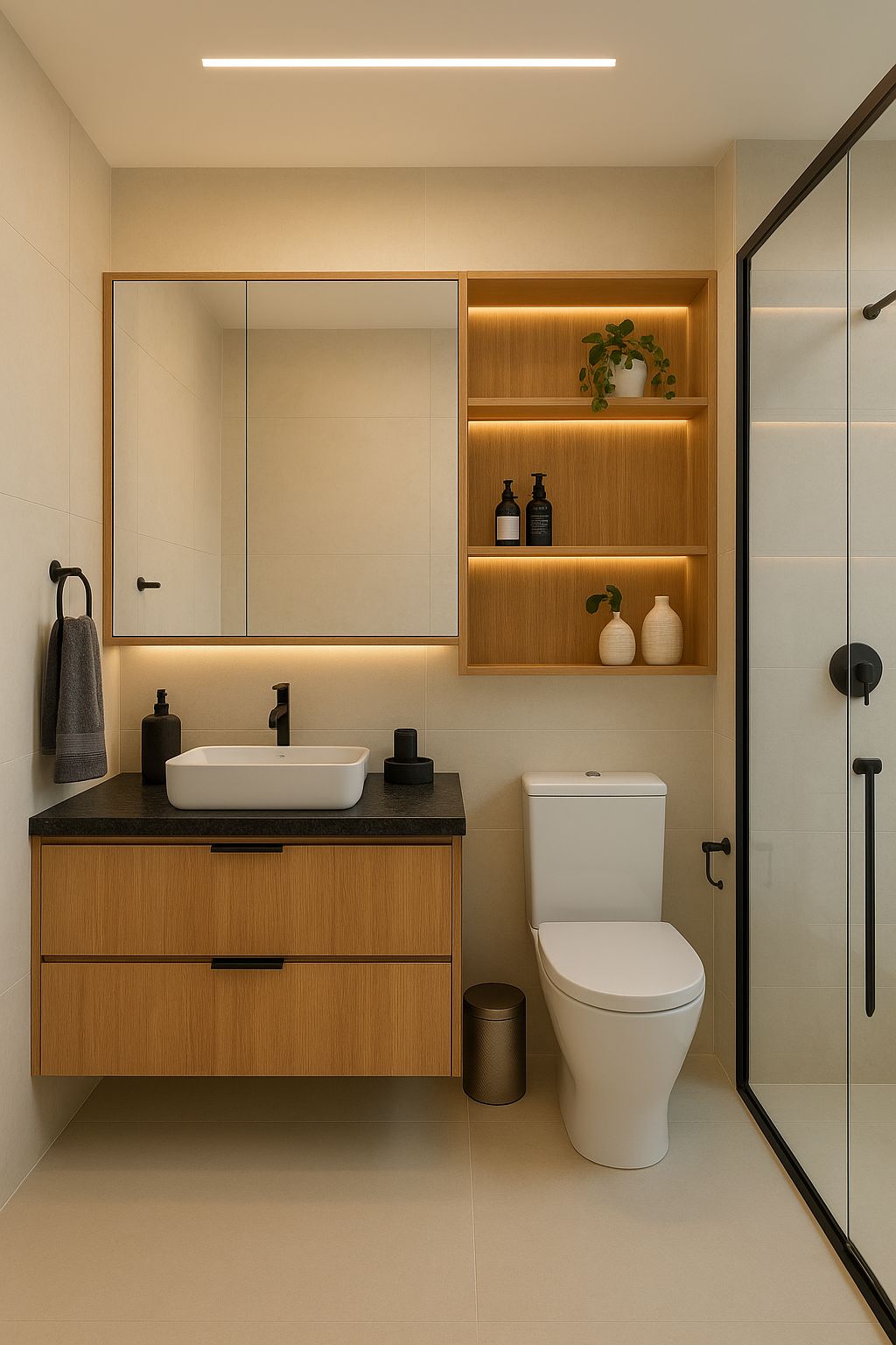 Na Bruly Planejados, projetamos gabinetes e armários aéreos que aproveitam espaços muitas vezes negligenciados, como sobre o vaso sanitário ou cantos estreitos.